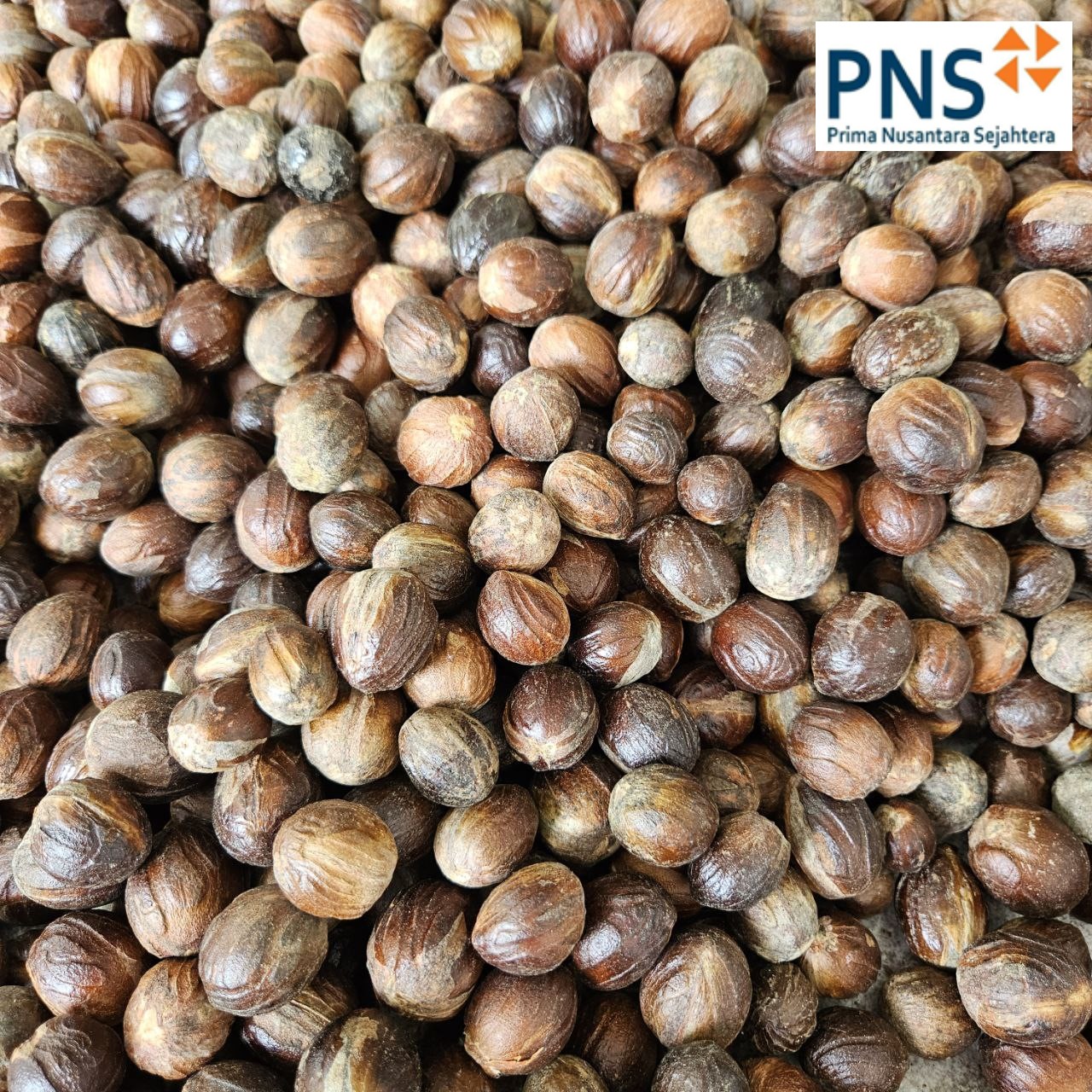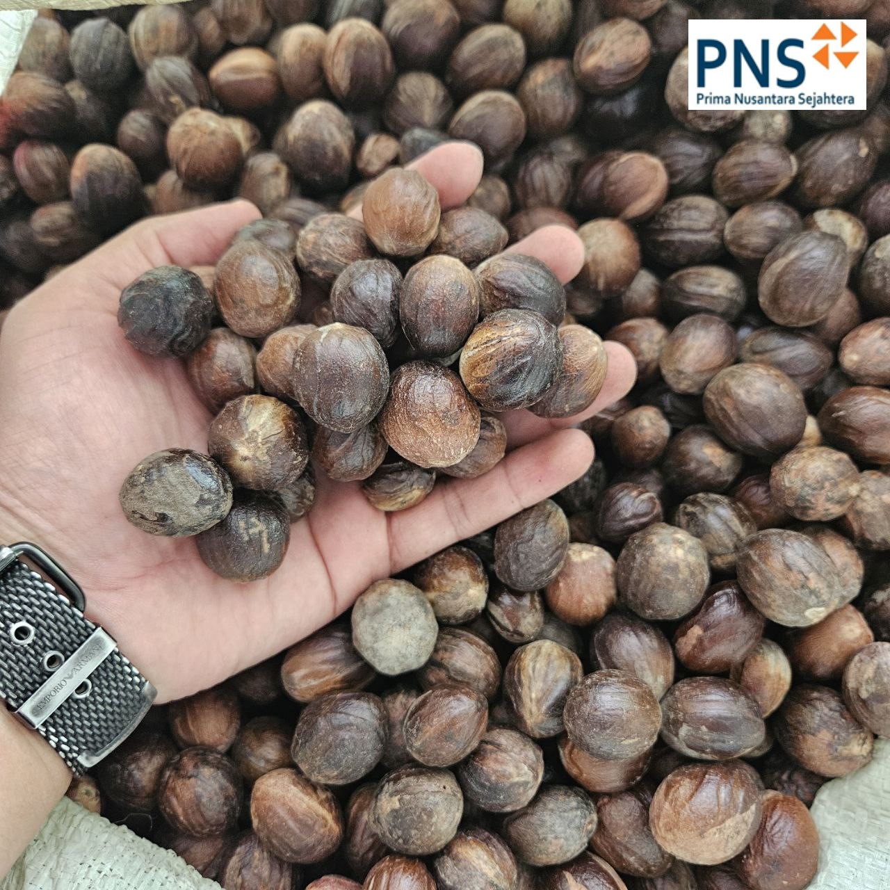 NUTMEG IN SHELL refers to the whole nutmeg seed still encased in its natural hard outer shell, as it appears after being removed from the fruit of the Myristica fragrans tree but before the inner seed has been fully processed or ground.